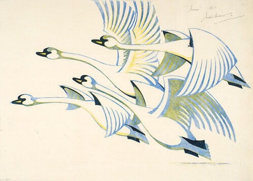 In celebration of Women’s History Month, this week’s bulletin art is a linocut print by modernist artist, Sybil Andrews titled “Swans”, 1939.