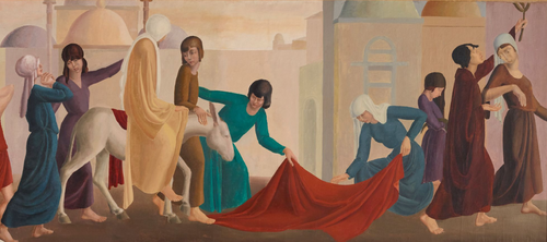 New Zealander artist, circa 1935. It depicts Jesus riding triumphantly into Jerusalem on a donkey. His supporters spread cloaks before him.